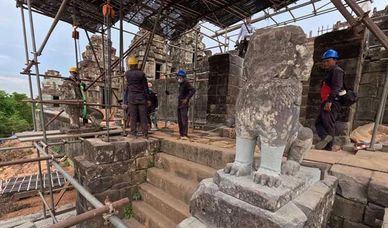 The Apsara National Authority’s (ANA) restoration team is repairing the southern stairs and lion statues of the Phnom Bakheng temple.